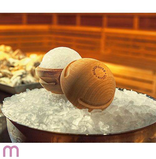 Die Eisaufguss-Kugel ist eine Form, mit der aus Schnee oder feinkörnigem Crushed-Ice Kugeln geformt und mit einem Duftmittel angereichert werden können. Die zwei gedrechselten Holzschalen, aus denen die Eisaufguss-Kugel besteht, sind geölt und verfügen über Griffnuten für einen besseren Halt.