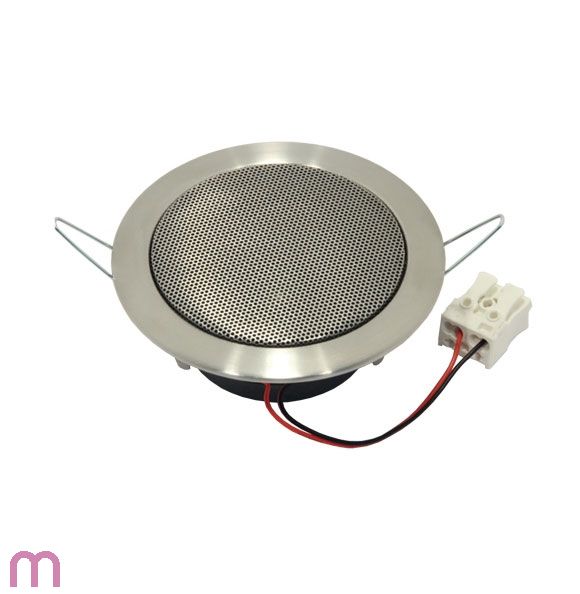 Deckenlautsprecher aus Edelstahl in gebürsteter Optik. Geeignet für den Einbau in Unterdecken aller Materialien. Rationelle Montage in kreisrundem Lochausschnitt mit Federbüglen, elektrische Verbindung mit Druckfederklemme. Platzsparende und gut klingende Lösung für den professionellen Bereich und den Heimbereich.
