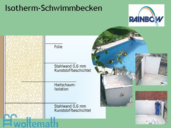 Isotherm-Schwimmbecken lassen sich ganz individuell nach Maß aufbauen und sind damit genau die richtige Wahl für Ihr Grundstück. Legen Sie selbst die Größe und Form, aus geraden Elementen, Ihres Pools fest. Die Elemente bestehen aus 60 mm starken Isolierplatten und sind, für den einfachen Aufbau, mit Nut und Federn ausgestattet. Die Standardgröße der einzelnen Elemente beträgt 110 cm in der Breite und 150 cm in der Höhe. Sonderanfertigungen nach Maß sind möglich. Abdeckschiene und Boden-U-Profile bestehen aus verzinktem 1,5 mm starkem Stahlblech.