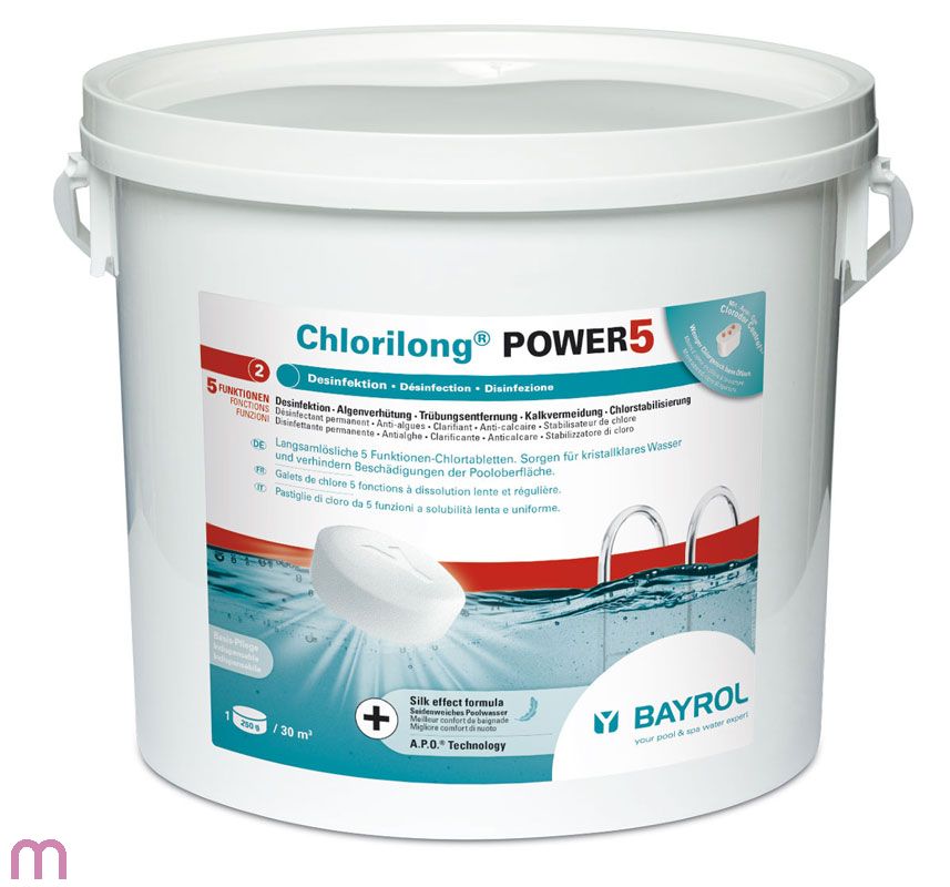 Chlorilong® POWER5 übernimmt 5 Funktionen: die Wasserdesinfektion, Algenverhütung, Trübungsentfernung, Kalkvermeidung und Chlorstabilisierung. Qualitativ hochwertige 250 g Tabletten für eine gleichmäßige Chlorabgabe und sichere Einhaltung des Desinfektionswerts im Poolwasser.