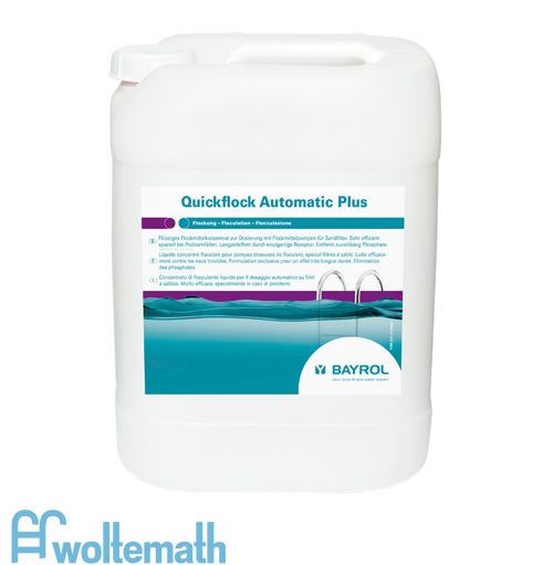 Bayrol Quickflock Automatic + 20 Liter ist ein flüssiges Flockmittel/schaumfreies Algizid für Schwimmbäder mit Sandfilteranlage (nicht in Verbindung mit Kartuschenfiltern!) einsetzbar für das Flockmatic System. Durch die Flockung werden bisher nicht filtrierbare, kleinste Trübstoffe entfernt, das Wasser wird kristallklar.